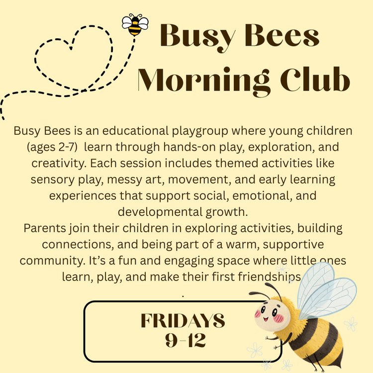 Busy Bees is all about slowing down, playing together, and connecting with your child through simple, educatonal, meaningful activities. Come ready to play, explore, and make memories together — we can’t wait to see you! Join us on Fridays to play, learn and grow.! Time: 9:00-12:00 9:00………………………………….Welcome, come and explore 10:00……………………………… Special Activity 10:30………………………………..Time to explore and play 11:00……………………………......Snack and a story 12:00……………………………......Time to pick up and say goodbye!